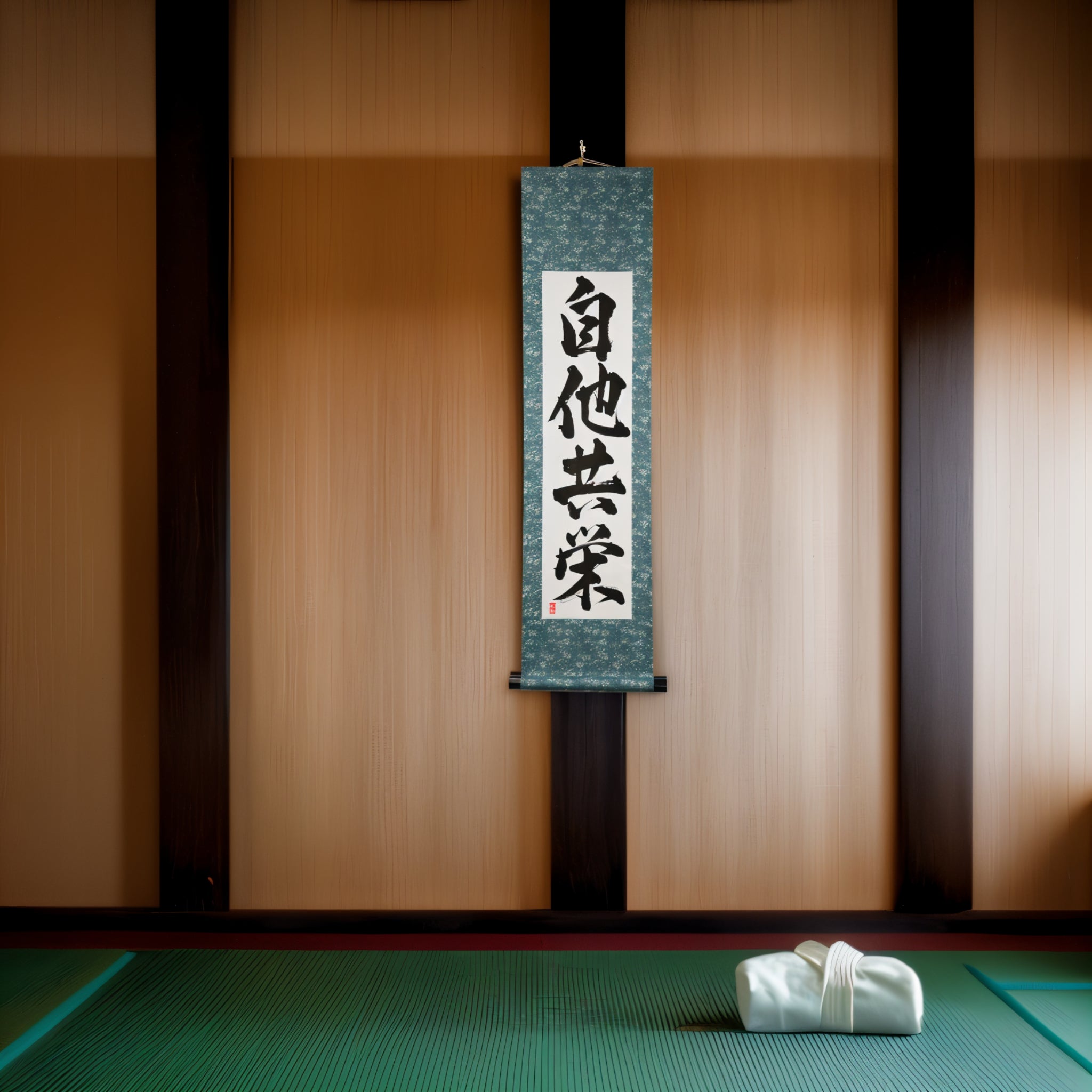 This Japanese calligraphy scroll features the timeless phrase 自他共栄 (Jita-Kyōei) — translated as "Mutual Welfare and Benefit". It is one of the two core principles of Judo, alongside 精力善用 (Seiryoku-Zenyō, "Maximum Efficient Use of Energy"), both established by Judo’s founder, Jigoro Kano (嘉納治五郎).