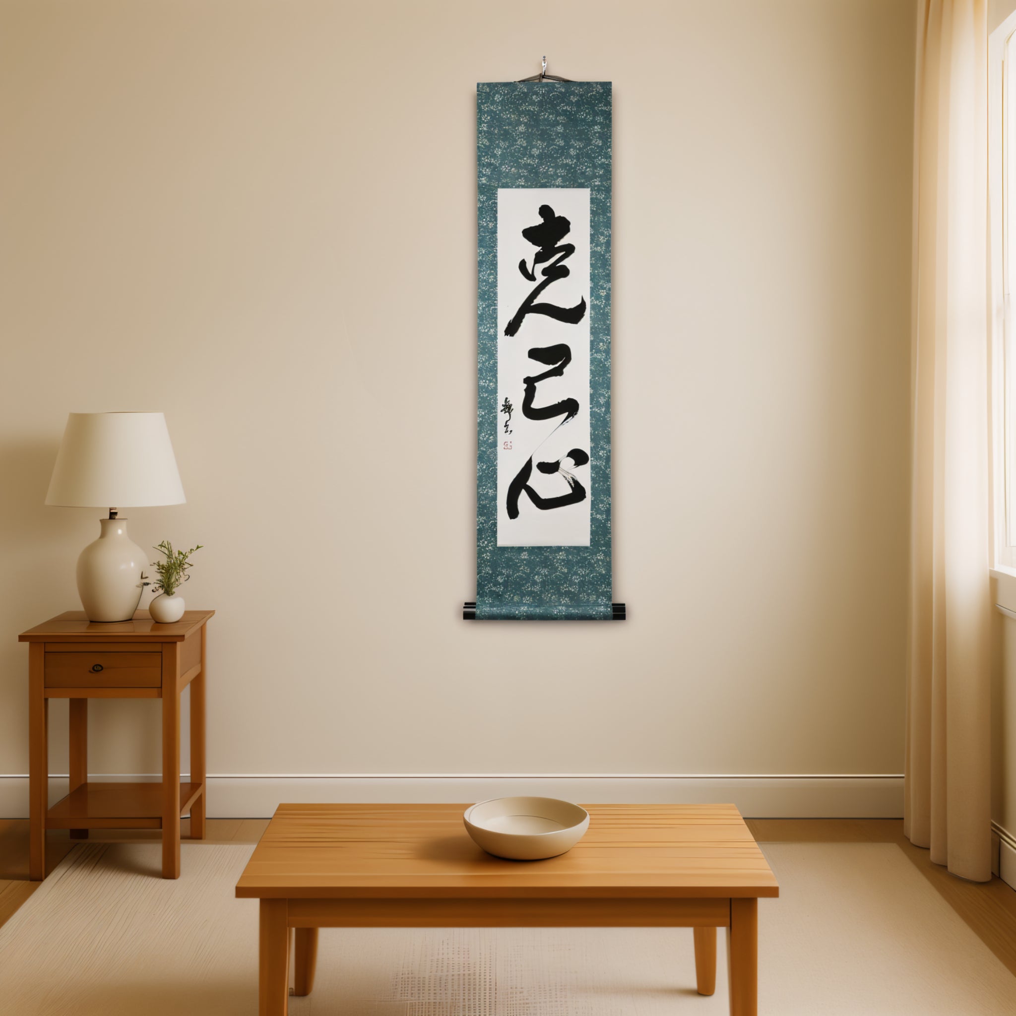 This Japanese calligraphy scroll features the powerful term 克己心 (Kokkishin), meaning "the spirit of self-mastery". It represents a universal principle across Karate, Judo, and Aikido — the idea that the greatest opponent is often within.