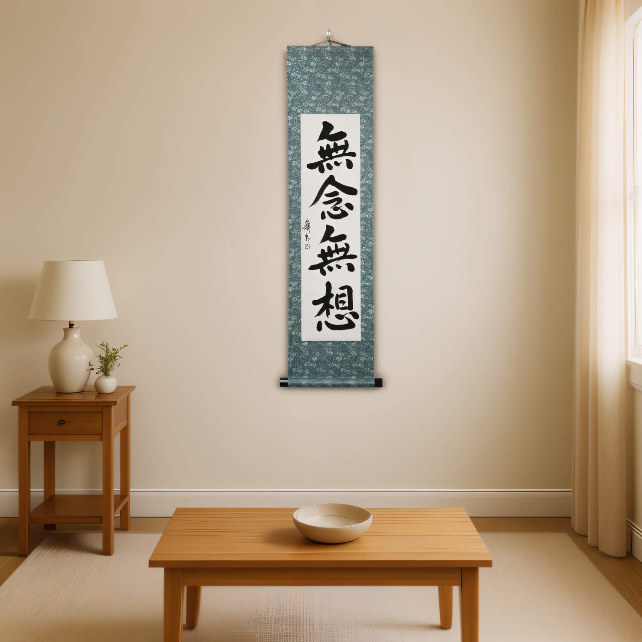 This Japanese calligraphy scroll presents the profound 禅 (Zen) principle 無念無想 (Munen Musō) — a state of mind free from thought and distraction, fundamental to the Samurai’s way. Rooted in both 禅 (Zen) practice and 武士道 (Bushidō), 無念無想 allows the warrior to act with pure presence, responding intuitively and decisively in every moment.