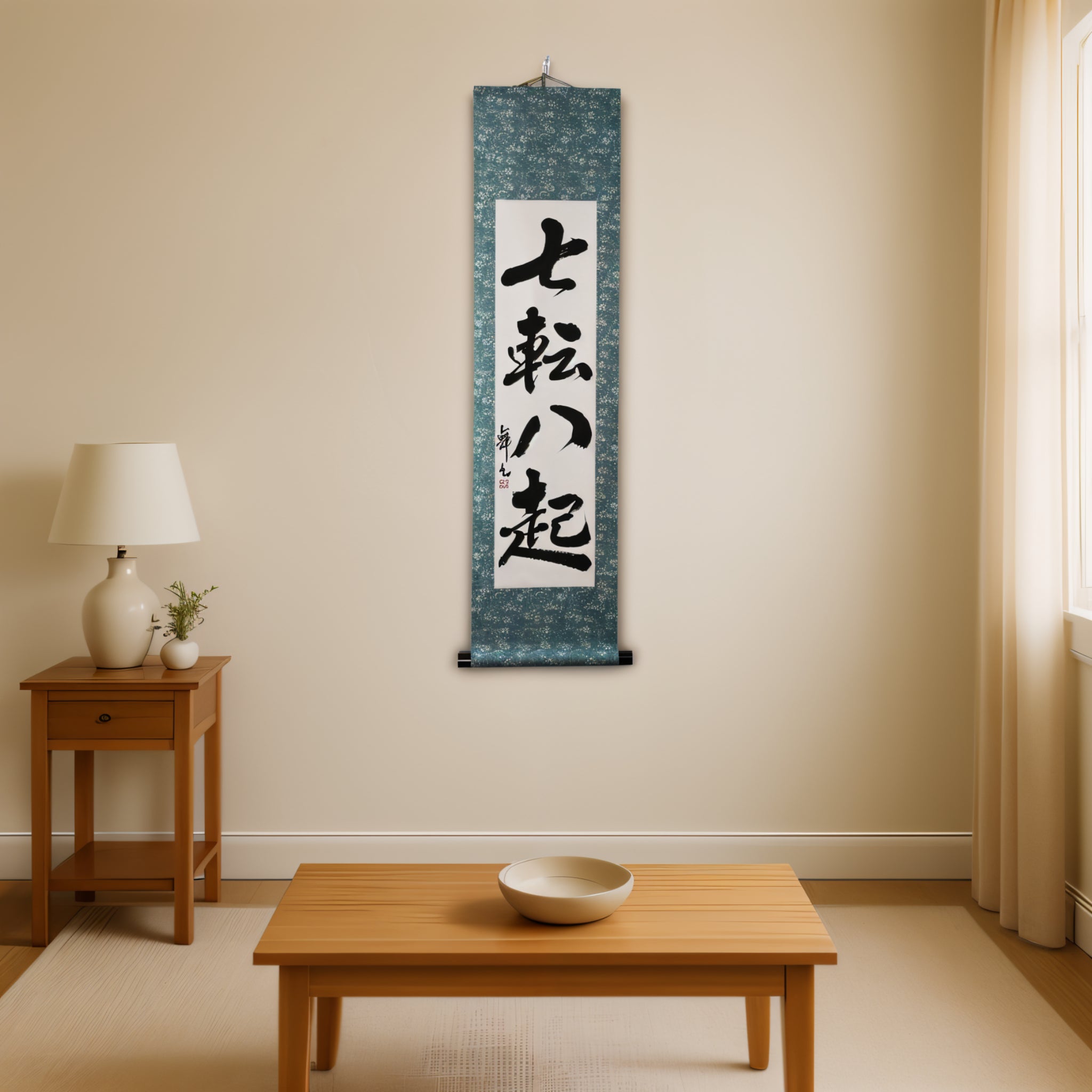 This Japanese calligraphy scroll features the powerful phrase 七転八起 (Shichiten Hakki) — meaning "Fall seven times, rise eight". It embodies the indomitable spirit of the samurai: the unwavering resolve to rise again, no matter how many times life knocks you down.